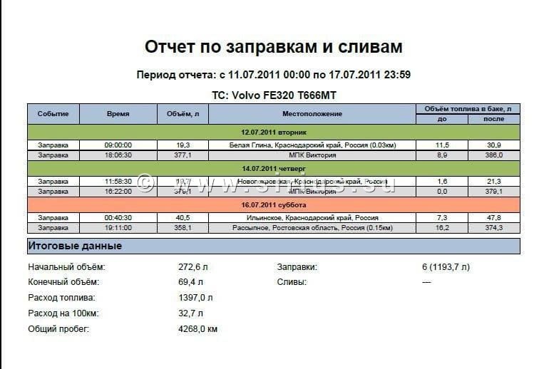 Также информация по контролю горючего доступна в табличной форме в отчете "Заправки и сливы". Данный отчет показывает в табличной форме где, когда и сколько было заправлено или слито. В этом отчете отображается абсолютный расход в литрах и относительный л/100км за заданный период. Для контроля по уровню необходимо подключится к штатному датчику (это практически бесплатно, но возможны сильные погрешности) или установить дополнительный датчик уровня топлива. После установки прибора контроля топлива или подключения к штатному датчику уровня топлива необходимо оттарировать бак. Этот процесс достаточно сложный и долгий, но без его проведения даже самые лучшие датчики контроля дизельного топлива не смогут дать точные показания.